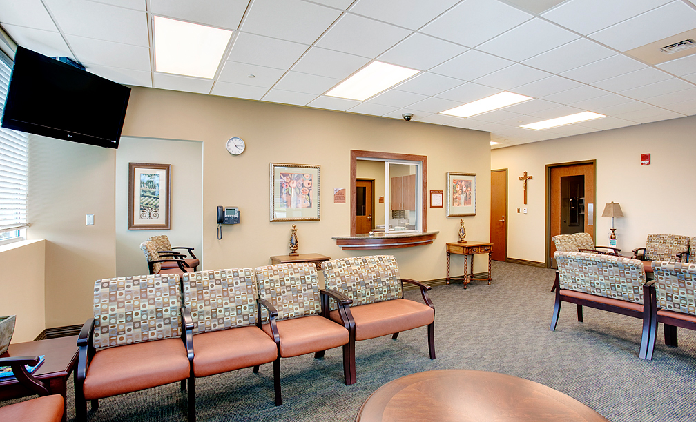 A two-story entry lobby and atrium serves as a clear orientation point for visitors. The rounded corner of the atrium extends upward to a “crown of thorns” tower, creating a recognizable architectural feature that reinforces the building’s presence within Mercy Medical Center.
