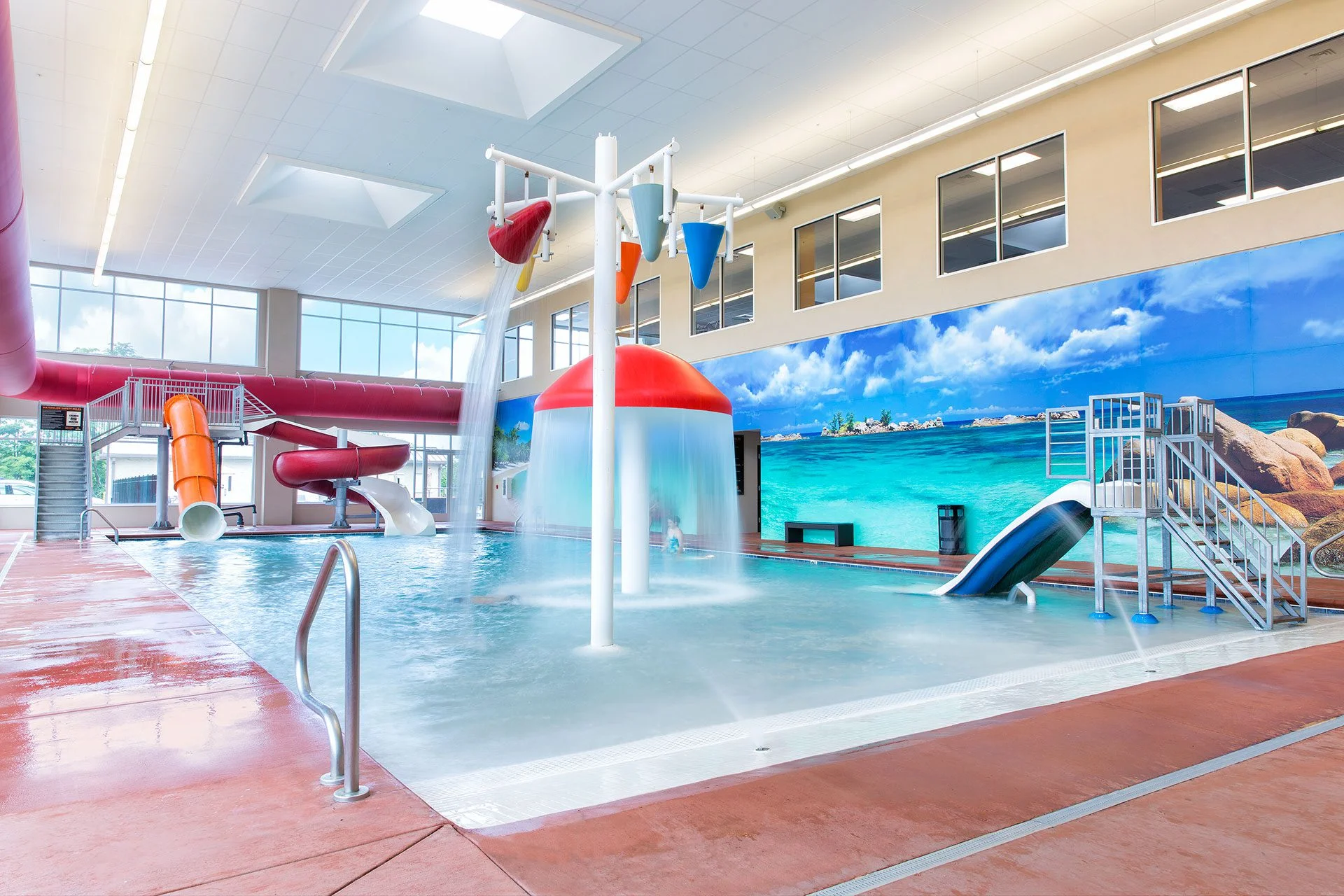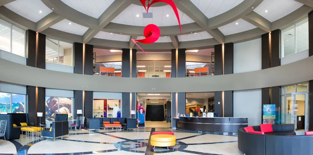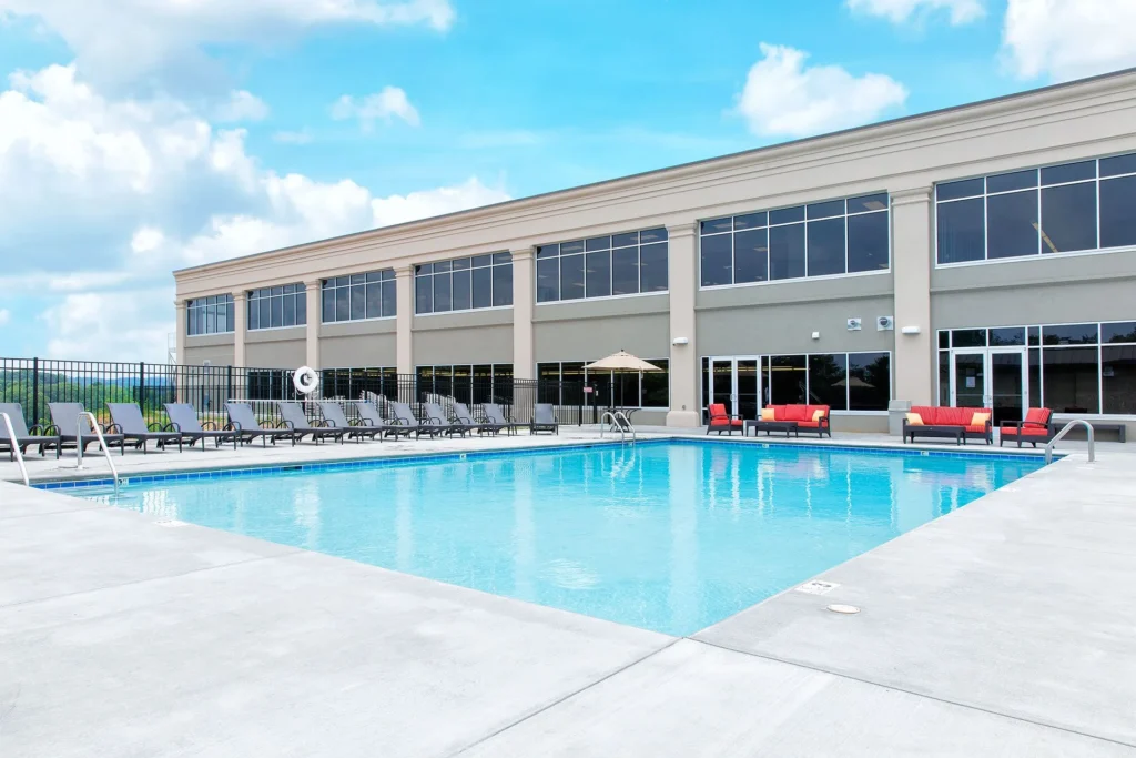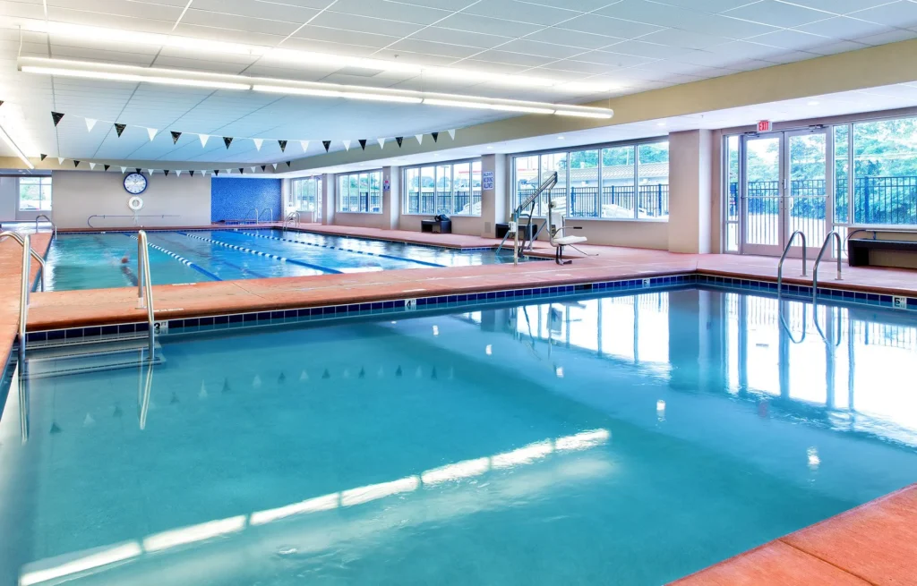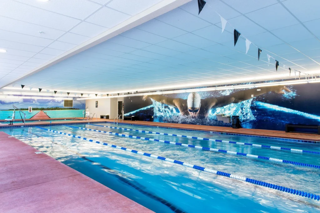 Five distinct pool environments (spa, aerobics, lap, family fun, and outdoor) support a range of activities, creating a flexible, family-focused fitness environment that has been featured in multiple health and fitness publications.