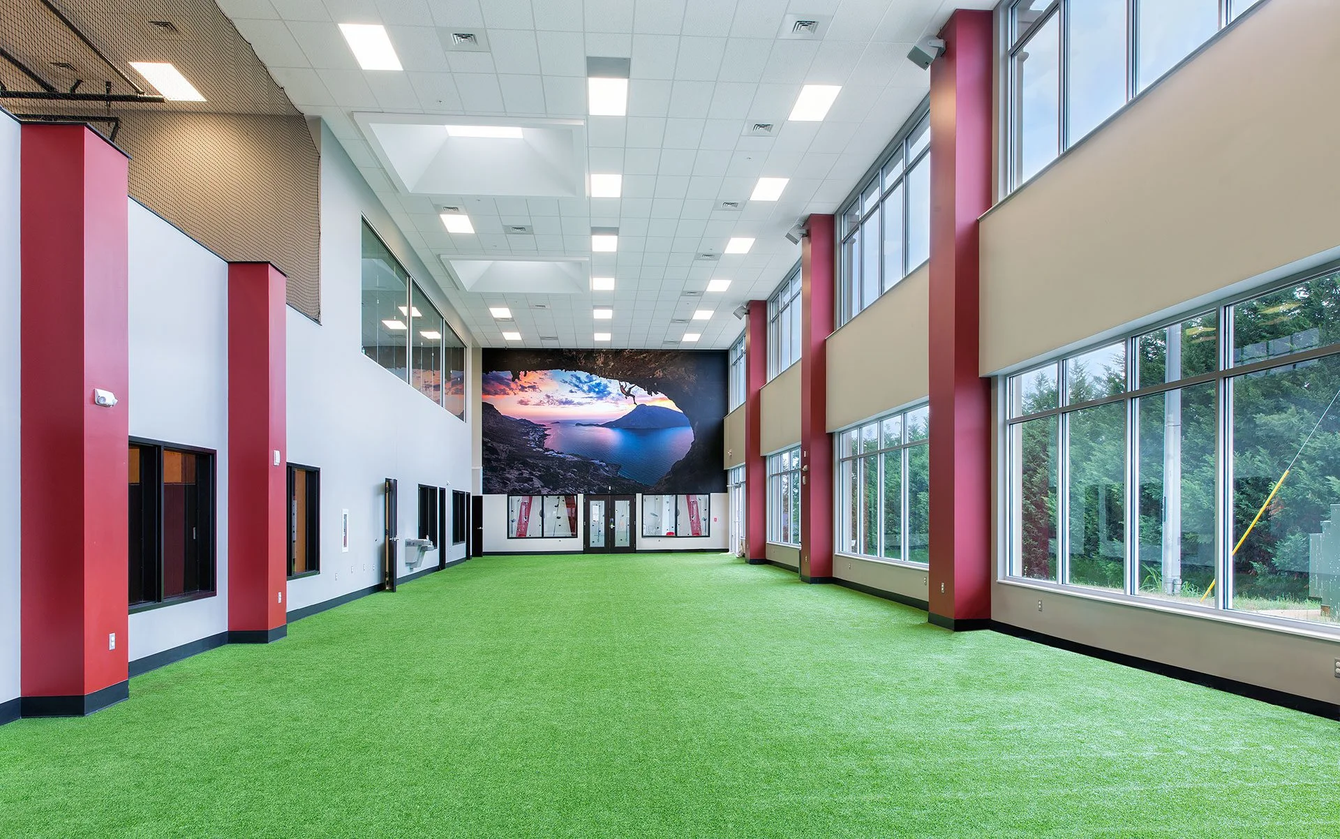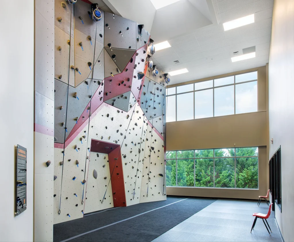 The interior program includes indoor and outdoor pools, weight-lifting areas, an indoor running track, rock climbing walls, racquetball and basketball courts, spin studios, personal training spaces, a cardio cinema, and a juice bar café.