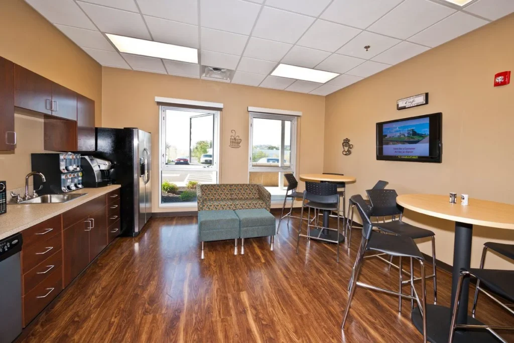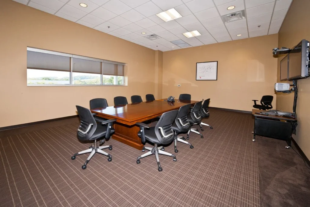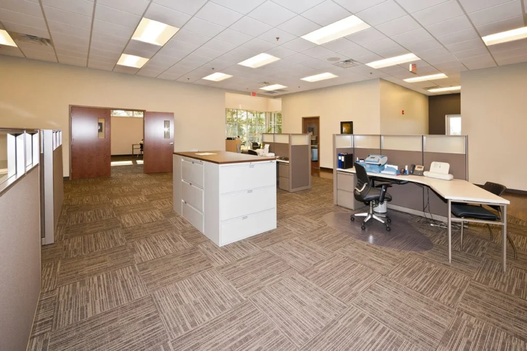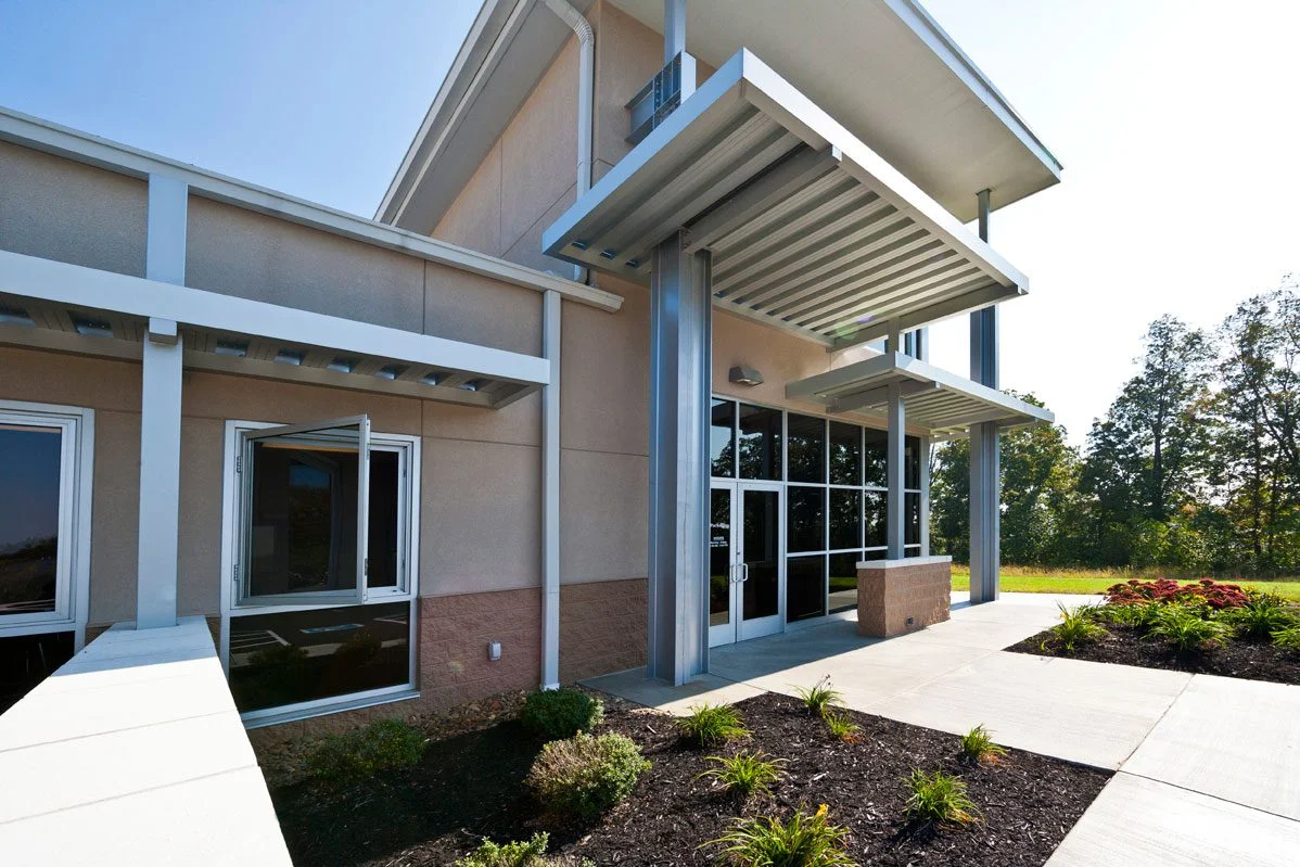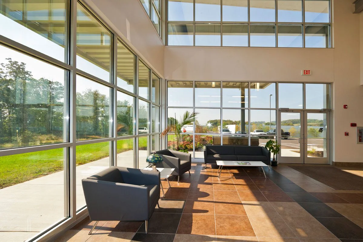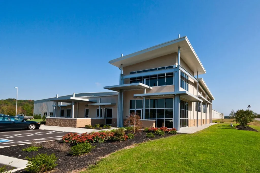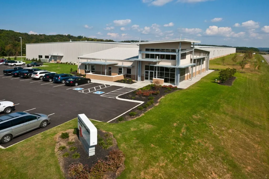 Visibility from I-75 influenced the building’s form. An elevated office tower doubles as a two-story lobby and creates a strong presence along the interstate, clearly distinguishing the office component from the larger production and warehouse spaces.