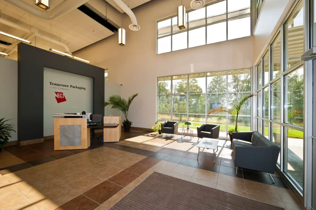 Tennessee Packaging is a 159,000 sq ft industrial facility designed to combine design offices, production, and warehousing for cardboard box manufacturing. The building includes five receiving docks and five shipping docks, separated and positioned adjacent to their respective operations to support efficient workflow.