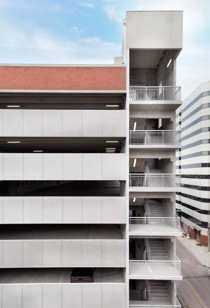 The completed garage provides functional parking while responding to both site constraints and its downtown context.
